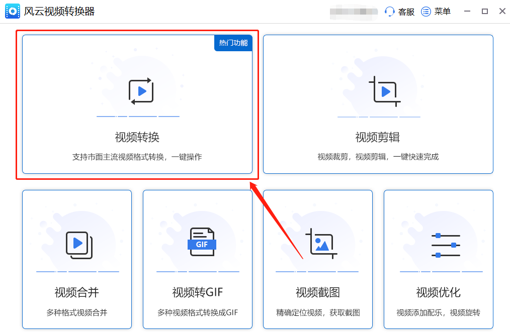 需要准备的工具:视频素材与风云视频转换器。(风云视频转换器可以在浏览器中查找下载哦)第一步,打开风云视频转换器,我们可以在首页菜单中,看到各种视频编辑功能,点击第一个热门功能,也就是“视频转换”,进入到转换页面。