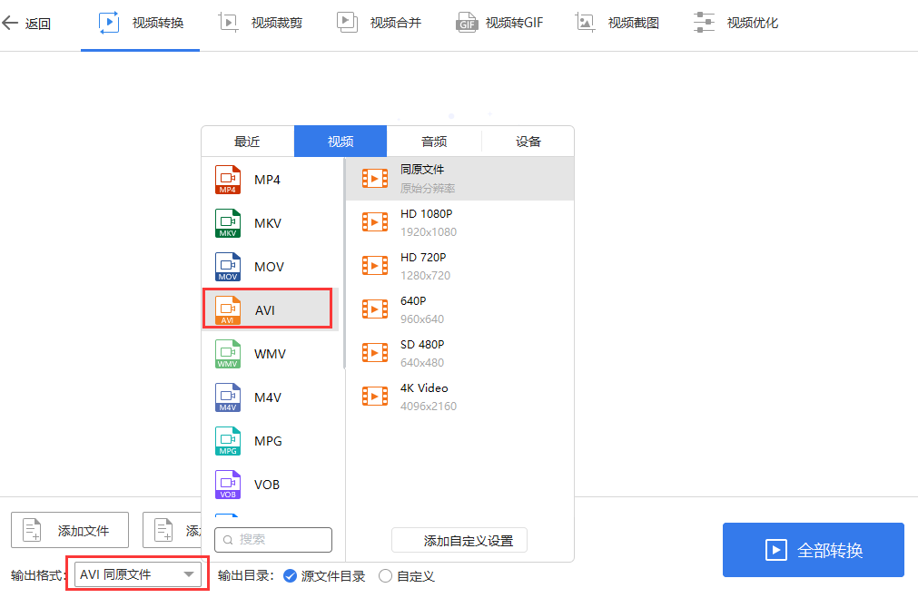 第二步,在视频转换界面,查看到左下角的“输出格式”,我们点击一下,然后选择“AVI”视频格式,再选择AVI格式中的视频画面分辨率,根据您对视频需求选择即可。