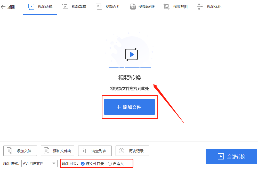 第三步,设置好输出格式后,我们看到输出格式右侧的“输出目录”,选择好转换后文件的保存地址,这里可以选择“源文件目录”(即导入文件保存地址)或者“自定义”。选择完成后,我们就可以添加文件了,有两种添加文件方式,用户可以通过拖拽文件到此处快速添加文件,也可以通过点击“添加文件”,来添加准备好的视频素材。