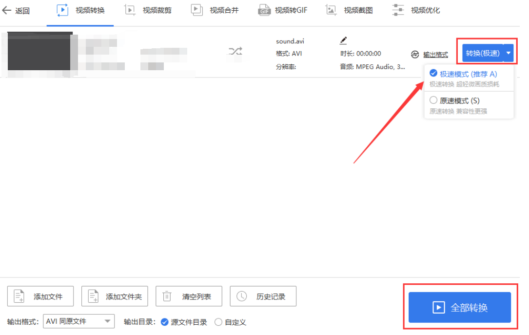 第四步,导入文件后,我们就可以点击右下角的“全部转换”,快速进行格式转换啦,这种方法比较适用于批量进行文件转换。单独视频格式转换的话,也可以点击视频右侧的“转换”,选择转换方式,这里小编也比较推荐“极速模式”,可以让您的视频减少更多损耗,转换效率更高。当然“原速模式”兼容性也更强,用户可以根据需求选择。